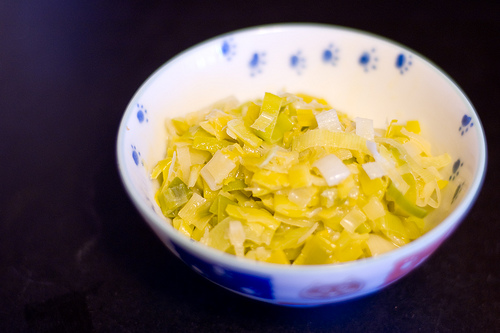 I made this from the plethora of leeks I received in my produce box recently. I especially liked the last suggestion, to have with a baguette and goat cheese. My goodness, is this stuff amazing. I want to put it on everything I eat.