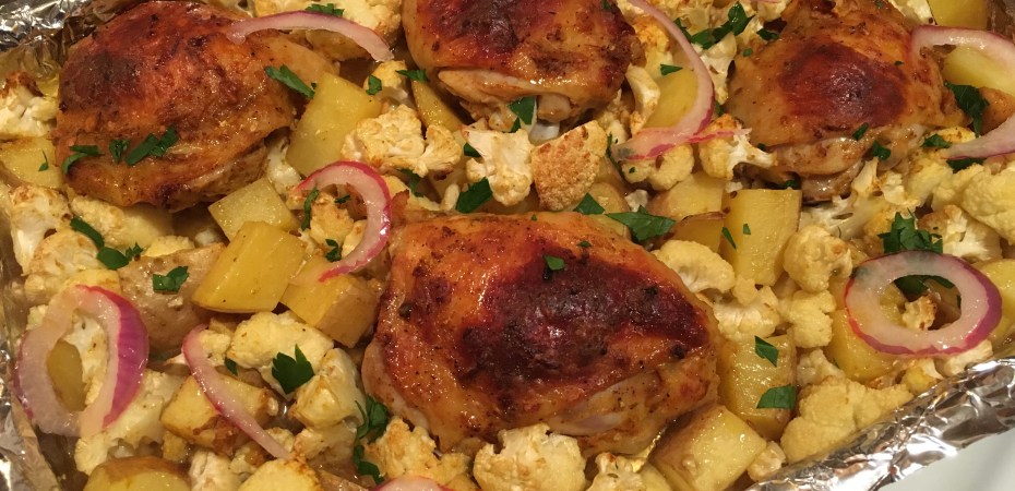 I really like the idea of sheet pan dinners, so I’ve been seeking out some recipes that use this method. The entire meal cooks at once in one pan in the oven, which is super easy for a weeknight. Love the flavors of this dish!