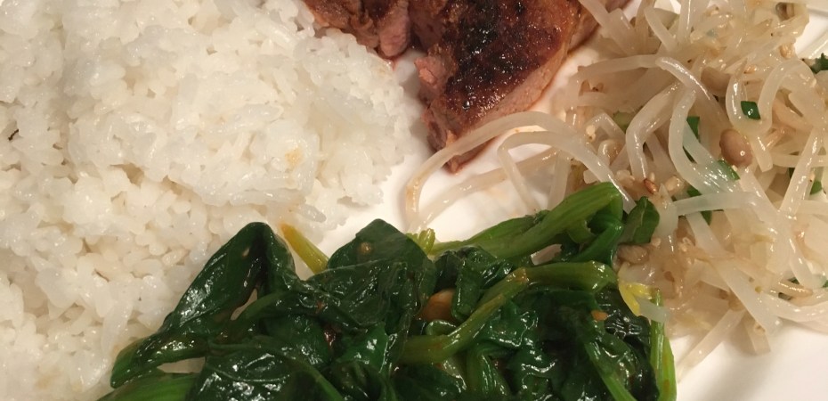 Gochujang Pork Shoulder Steaks, served with Sukju Namul Muchim, Sigeumchi Namul, Short Grain Rice.