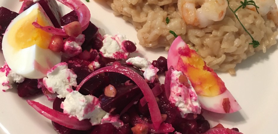 Two of the main salad ingredients came from our friends at Milk Bark Farm – both the beets and eggs! The risotto is a dish I’ve made many times before; it makes a great side dish or main, depending on the proteins you use (sometimes we do shrimp/prawns, or scallops).