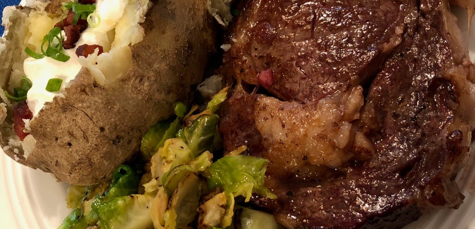 Reverse-seared Rib Eye, “Baked” Potato (cooked in the Instant Pot), and Brussels Sprouts. This was a lot of food but made great leftovers!